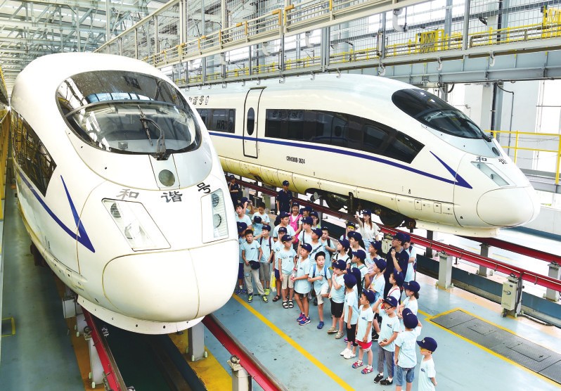 日前,安徽合肥市包河区常青街道开展“感受动车之家”暑期体验活动,组织辖区儿童来到合肥南动车运用所,在技术人员陪同下近距离接触动车,参观动车检修运用的全过程,了解动车的先进技术和发展历程。图为合肥南动车运用所技术人员向小朋友介绍动车检修流程。