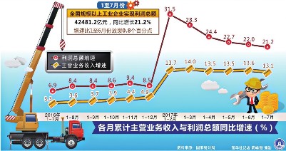 国家统计局27日发布的工业企业财务数据显示,2017年1-7月份,规模以上工业企业利润同比增长21.2%,增速比1-6月份放缓0.8个百分点。其中,7月份利润同比增长16.5%,增速比6月份放缓2.6个百分点。利润增速放缓主要受极端高温天气条件下部分企业放假、停产等短期非经济因素影响。国家统计局工业司何平博士分析认为,总体看,随着供给侧结构性改革持续推进,企业效益同比呈现好转态势,工业利润继续保持较高增速。 具体来看,降成本成效有所扩大。7月份,工业企业每百元主营业务收入中的成本费用为93.12元,同比下降0.29元,比6月份多降0.11元。其中,每百元主营业务收入中的成本为85.9元,同比下降0.13元;每百元主营业务收入中的费用为7.22元,同比下降0.16元。 降低企业杠杆率取得积极进展。7月末,规模以上工业企业资产负债率为55.8%,同比下降0.7个百分点。其中,国有控股企业资产负债率为61.1%,同比下降0.5个百分点。 工业产成品“去库存”持续推进。7月末,规模以上工业企业产成品存货同比增长8%,增速比7月份主营业务收入低2.1个百分点;产成品周转天数为13.7天,同比减少0.8天。 企业资金周转持续加快。7月末,规模以上工业企业应收账款平均回收期为37.1天,同比减少1天。 利润率同比进一步提高。7月份,规模以上工业企业主营业务收入利润率为5.97%(因季节因素低于6月份),同比提高0.33个百分点,增幅比6月份加大0.04个百分点。 国有控股企业效益显著回升。7月份,规模以上工业企业中,国有控股企业利润同比增长34.2%,增速比6月份加快13.5个百分点;其中,中央企业利润同比增长8.5%,扭转了6月份同比下降6.5%的局面。主要归因于石油加工、煤炭和钢铁等行业效益明显提升。