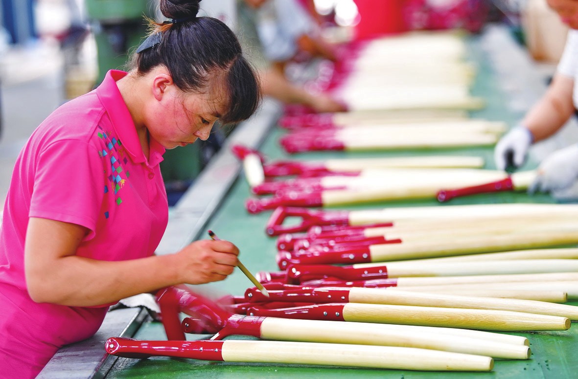 近年来,“钢锹之乡”河北省滦南县引导企业加大产品研发力度,推动钢锹产业发展壮大、提档升级。全县目前有钢锹企业182家,产品远销140多个国家和地区。图为工人在河北滦南县一家钢锹企业生产车间工作。