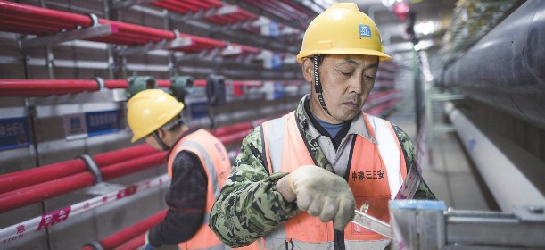 近日,由中建三局三公司承建的湖北咸宁城市地下综合管廊PPP项目一期建设工程正处于主体结构施工及廊内安装阶段。该工程建成后可将原本一条条单独铺设的线缆管线集中,使城市告别“蜘蛛网”“拉链路”,成为改善城市治理的“收纳神器”。据悉,据悉,该项目位于湖北省咸宁市高新技术产业园区,两条综合管廊共计5.06公里,初步规划入廊管线有电力、给水、燃气、通信、中水等5类管线,预计于2019年4月完工。图为施工人员在廊体内进行安装作业。