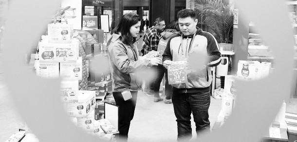 当日,2018广西电商年货节在南宁国际会展中心举行。据介绍,本次年货节通过线上线下互动,创新年货销售模式:除了在南宁国际会展中心举办三天的线下展销外,还将在京东、淘宝等电商平台上的广西各地特色馆以及上千家网店同步开展持续两周的年货线上促销活动。图为在广西南宁国际会展中心,一名参展商(左)在向顾客推介商品。