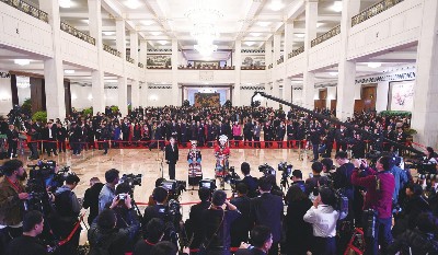 3月11日,十三届全国人大一次会议在北京人民大会堂举行第三次全体会议。这是全国人大代表卓嘎、刘蕾在“代表通道”接受采访。