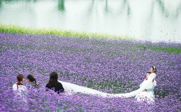 位于贵州省黔南布依族苗族自治州瓮安县猴场镇的草塘“十二塘”生态修复景区,是利用荒坡等开发出来的生态修复旅游景区。目前,景区内马鞭草迎来盛花期,吸引着众多游人前来观花赏景。图为两名年轻人在瓮安县草塘“十二塘”景区之一的马露塘生态修复区拍摄婚纱照。