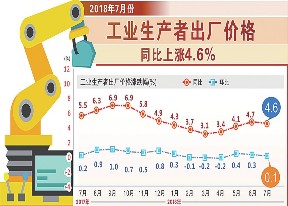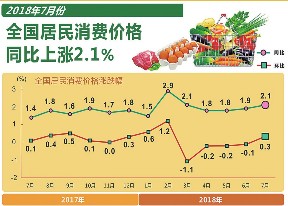 国家统计局9日发布数据,7月份,全国居民消费价格指数(CPI)同比上涨2.1%,涨幅比上月扩大0.2个百分点。受非食品价格上涨影响,CPI环比上涨0.3%。国家统计局城市司高级统计师绳国庆指出,暑假出行高峰,需求增加,飞机票、旅游和宾馆住宿价格分别上涨14.5%、7.9%和2.2%,三项合计影响CPI上涨约0.19个百分点,是CPI上涨的主要原因。 从环比看,7月份城市CPI上涨0.4%,农村上涨0.1%。除暑假因素外,居住和医疗保健价格均上涨0.2%,合计影响CPI上涨约0.07个百分点;成品油调价影响汽油和柴油价格均上涨0.9%,合计影响CPI上涨约0.02个百分点。食品价格由降转升,上涨0.1%,影响CPI上涨约0.03个百分点。 从同比看,7月份城市上涨2.1%,农村上涨2.0%;食品价格上涨0.5%,非食品价格上涨2.4%;消费品价格上涨1.8%,服务价格上涨2.5%。1-7月平均,全国居民消费价格比去年同期上涨2.0%。“据测算,在7月份2.1%的同比涨幅中,去年价格变动的翘尾影响约为1.4个百分点,新涨价影响约为0.7个百分点。”绳国庆表示。 同时公布的工业生产者出厂价格指数(PPI)显示,7月份同比上涨4.6%,环比上涨0.1%。工业生产者购进价格同比上涨5.2%,环比上涨0.1%。 绳国庆指出,据测算,在PPI7月份4.6%的同比涨幅中,去年价格变动的翘尾影响约为3.9个百分点,新涨价影响约为0.7个百分点。 工业生产者出厂价格中,生产资料价格同比上涨6.0%,影响工业生产者出厂价格总水平上涨约4.50个百分点。生活资料价格同比上涨0.6%,影响工业生产者出厂价格总水平上涨约0.12个百分点。 工业生产者购进价格中,建筑材料及非金属类价格同比上涨10.8%,燃料动力类价格上涨9.9%,黑色金属材料类价格上涨7.7%,有色金属材料及电线类价格上涨5.6%;农副产品类价格下降0.7%。 1-7月平均,工业生产者出厂价格比去年同期上涨4.0%,工业生产者购进价格上涨4.5%。