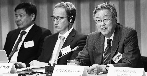 来自中欧学界、政界和商界的近百名代表日前在布鲁塞尔举行的“中欧美经贸关系:挑战与前景”研讨会上呼吁中欧加强对话,增进互信,深化各领域合作,共同维护全球多边贸易体系。图为在比利时布鲁塞尔,中国金融学会会长、中国国际经济交流中心顾问周小川(右)在“中欧美经贸关系:挑战与前景”研讨会上发言。