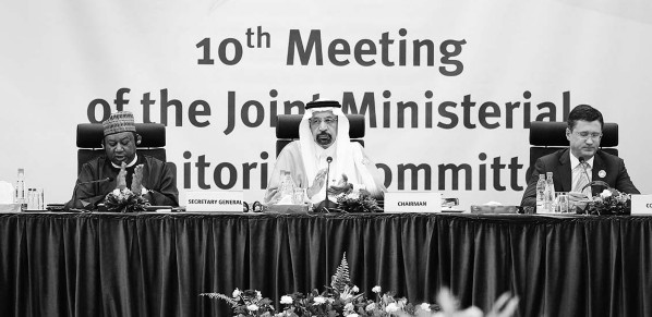 沙特能源大臣法利赫23日在阿尔及尔说,产油国目前没有就提高石油产量达成一致。图为在阿尔及利亚首都阿尔及尔,沙特能源大臣法利赫(中)参加第十次石油输出国组织(欧佩克)和非欧佩克产油国联合部长级监督委员会会议。