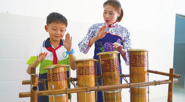 近年来,江西省崇义县思源实验学校定期开设竹乐课,邀请崇义县竹乐乐团的演员教授学生演奏竹排琴、竹板琴等竹乐乐器,激发学生了解传统文化的热情。图为崇义县竹乐乐团的演员在教学生演奏竹鼓。
