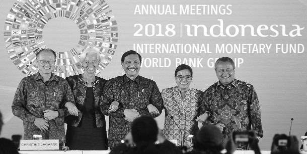 日前,2018年国际货币基金组织和世界银行年会在印尼巴厘岛闭幕。图为(从左至右)世界银行行长金墉、国际货币基金组织总裁拉加德、印尼海洋统筹部长卢胡特、印尼财政部长英卓华和印尼央行行长瓦吉约在印度尼西亚巴厘岛出席2018年国际货币基金组织和世界银行年会闭幕式。新华社/路透