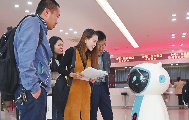 近日,江西省南昌市首个“政务服务智能机器人”在红谷滩新区行政服务中心大厅正式“上岗”。据了解,智能机器人“小π”采用VR智能机器人技术,通过智能交互系统,可以帮助市民通过自然的语音方式,轻松实现业务咨询、信息查询和政民互动。市民在南昌市红谷滩新区行政服务中心大厅向智能机器人“小π”咨询问题。万象/摄
