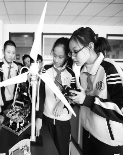 日前,山东青岛通济实验学校举办以“体验、求知、创新”为主题的“校园科技节”活动,激发学生们的创新意识和探索精神。学生们在老师的指导下体验了“机器狗”表演、3D打印、风车发电等十余个项目。山东青岛通济实验学校的学生体验风车发电。