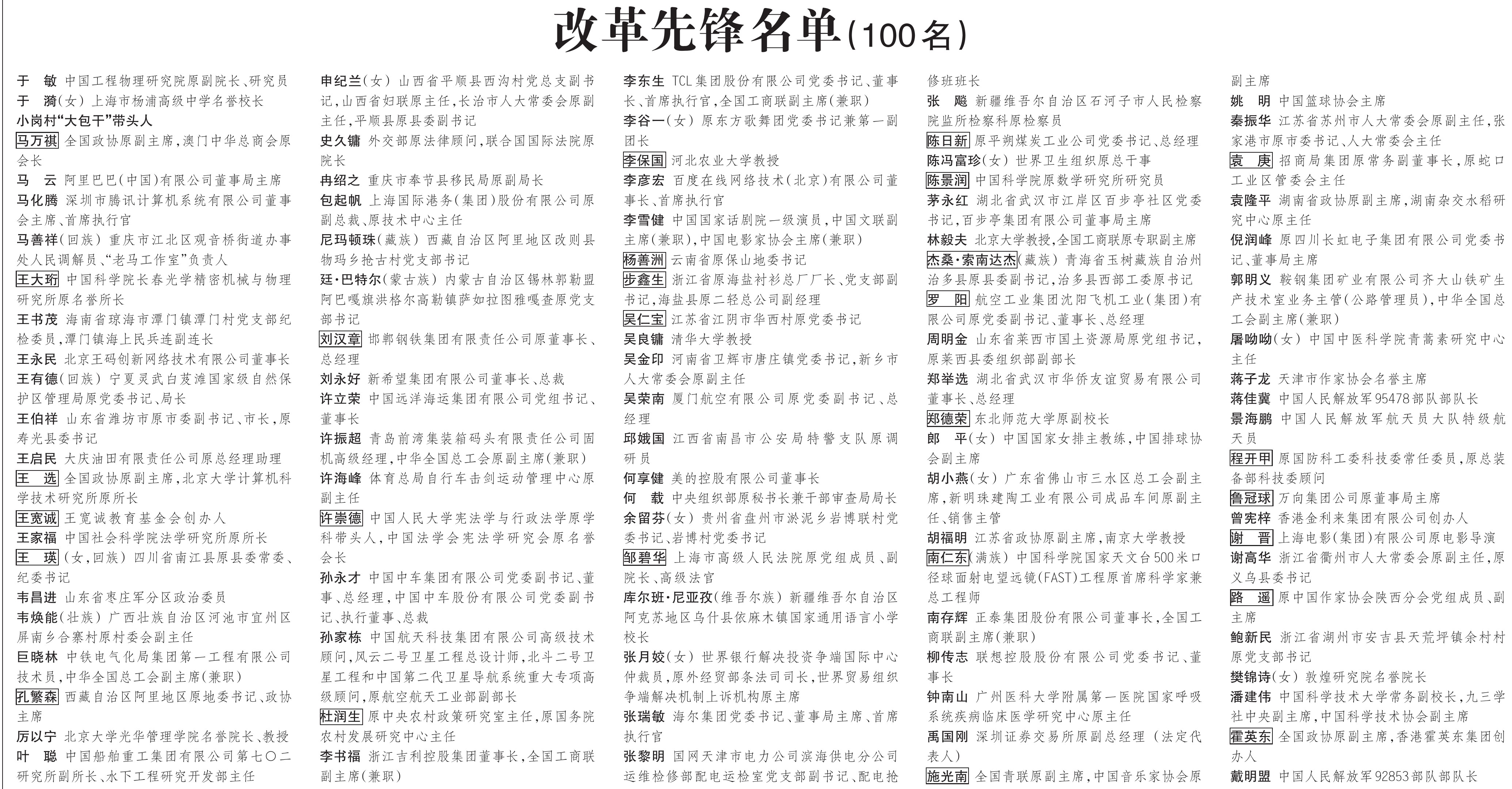 改革先锋名单(100名)