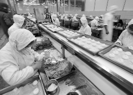春节将至,扬州特产“扬州包子”迎来销售旺季,当地包子生产企业一派繁忙。图为江苏扬州市汤汪乡一家包子生产企业,工人在车间里包包子。孟德龙/摄