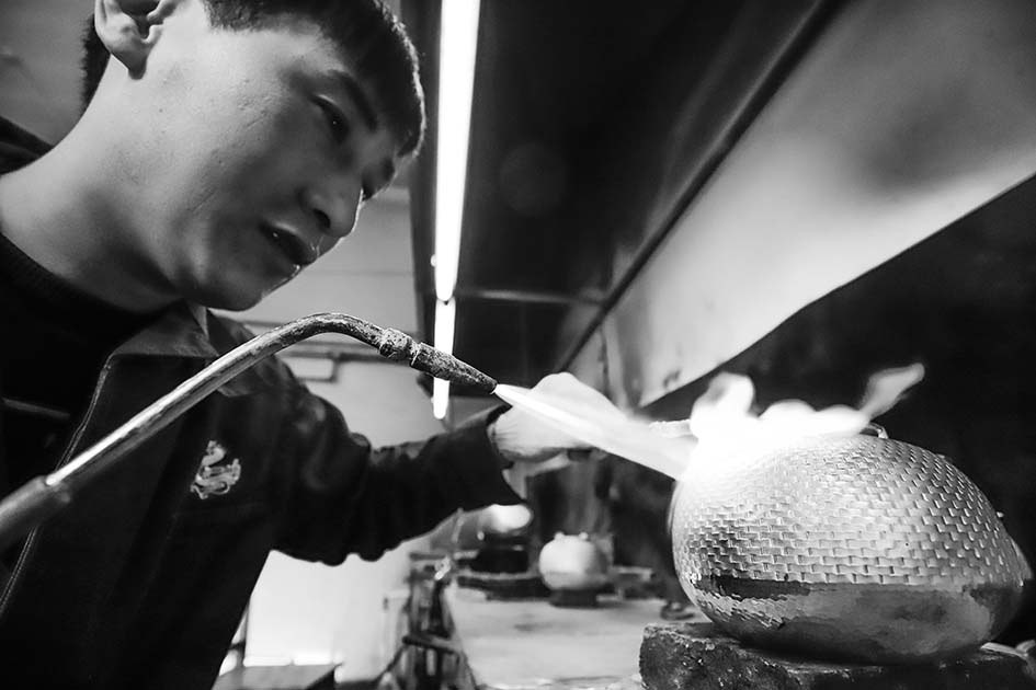 近年来,河北省遵化市马兰峪镇积极发展银器加工产业,目前,该镇有银器加工厂30余家,家庭作坊50余家,当地2500多名农民通过从事相关的银器加工、销售工作增加了收入。图为工人在河北唐山遵化市马兰峪镇一家银器加工作坊加工银器产品。
