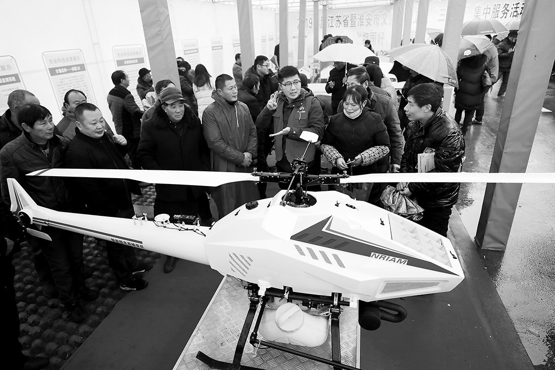 2019年江苏省淮安市文化科技卫生“三下乡”集中服务活动在盱眙县马坝镇启动。来自文化、科技、卫生等部门的工作人员为当地群众提供政策宣讲、农技指导、义诊体检、文艺演出等服务。图为科技人员在“三下乡”活动现场为居民介绍农业智能植保机。周海军/摄