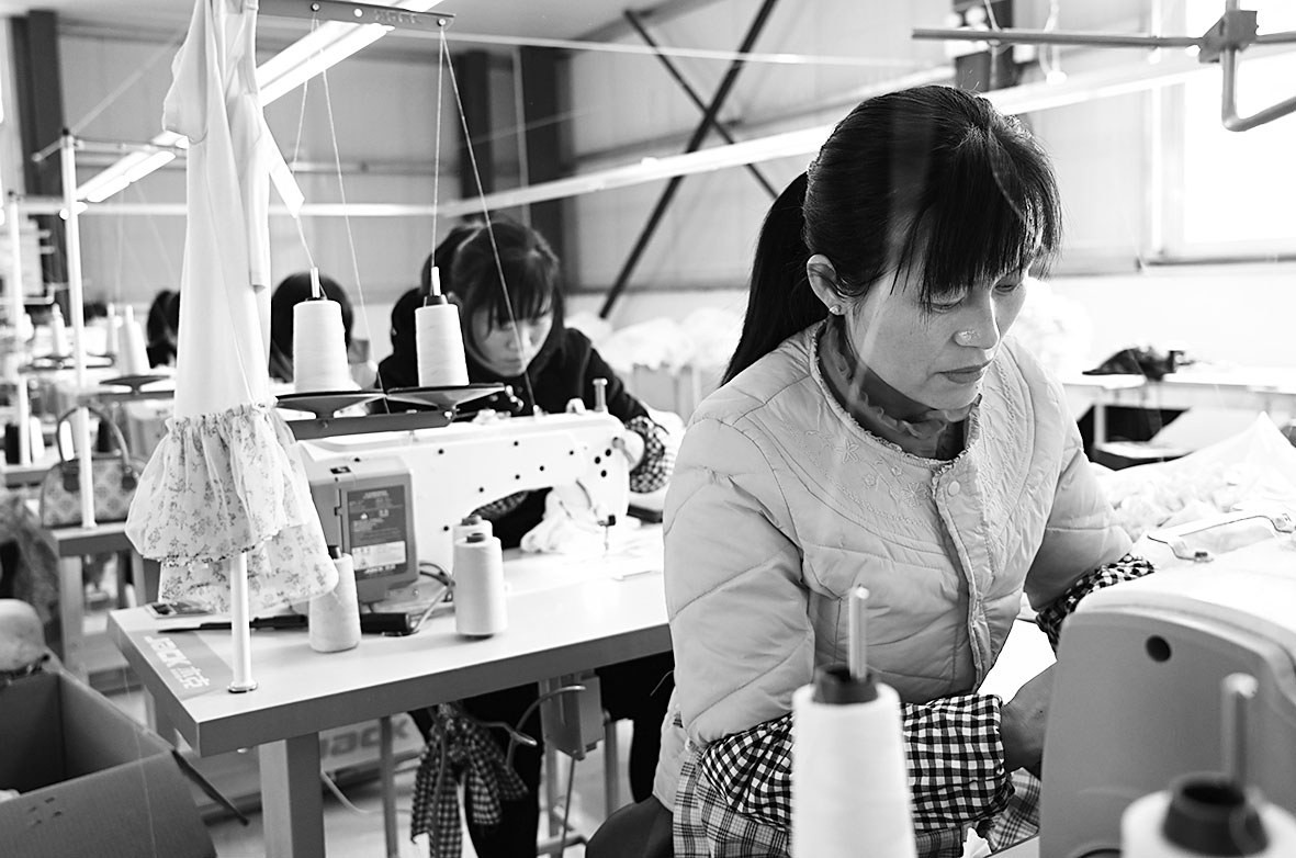 山东省菏泽市鄄城县在实施黄河滩区脱贫迁建工程的过程中,积极探索“滩区搬迁、产业先行”模式,在已建成入住的5个安置区建起电子厂、服装厂等扶贫工厂,吸收500多人就业。鄄城县黄河滩区脱贫迁建工程计划搬迁49个自然村,计划于2020年底全部完成。图为工人在孙沙沃(胡楼)安置区扶贫服装厂加工服装。范长国/摄