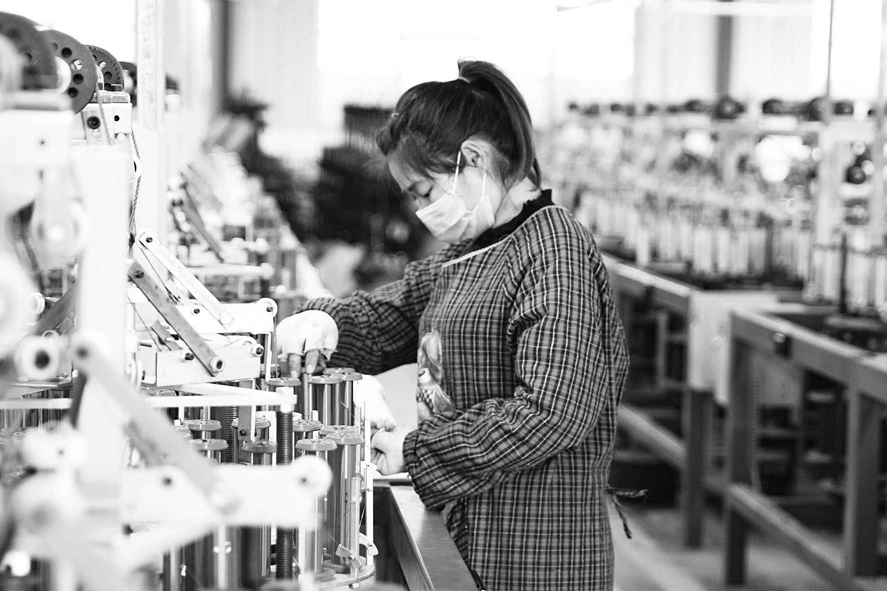 自脱贫攻坚开展以来,河南省睢县工商联积极推行“百企帮百村”“百凤还巢”工程,鼓励在外创业成功人士返乡创办企业、合作社带动贫困群众增收脱贫。目前,睢县工商联引导110个会员企业入驻全县117个扶贫车间,吸纳就业人数12122人,其中吸纳贫困人口就业5855人。图为河南睢县孙聚寨乡八蜡庙村扶贫车间内工人们正在赶制编织绳订单。徐泽源/摄