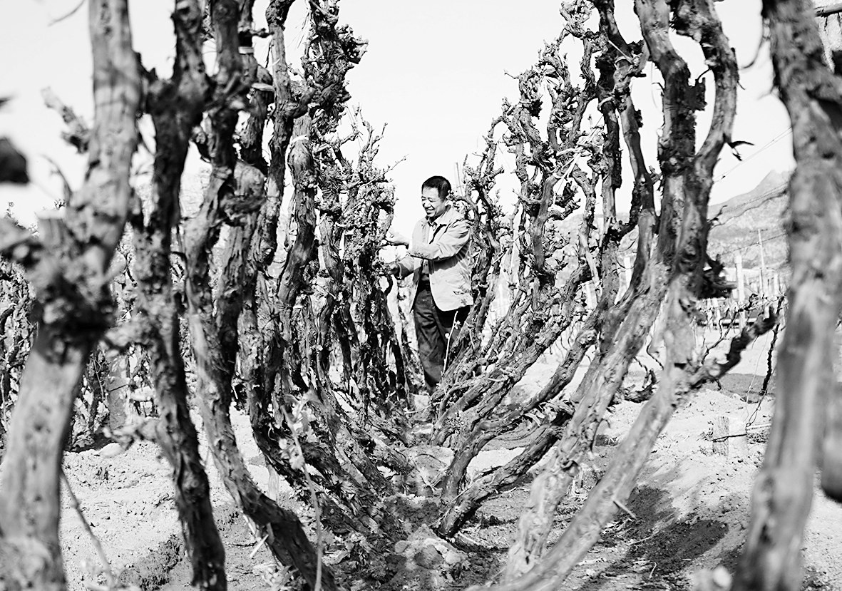 近日,素有“中国酿酒葡萄之乡”美誉的河北昌黎县的果农抢抓农时,开始对裸地葡萄藤剔芽,对大棚葡萄加强管理。据介绍,目前该县酿酒葡萄、鲜食葡萄种植面积达5万亩,年产值3亿多元。图为河北省昌黎县十里铺乡耿庄村的果农耿学刚给酿酒葡萄藤剔芽。