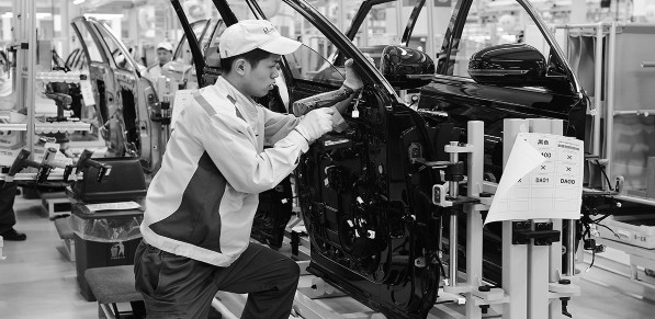 记者从中国第一汽车集团有限公司获悉,该公司旗下红旗品牌汽车2019年上半年共计销售33242辆,同比增长255%,超越2018年全年销量。图为职工在一汽红旗总装车间内装配车门。