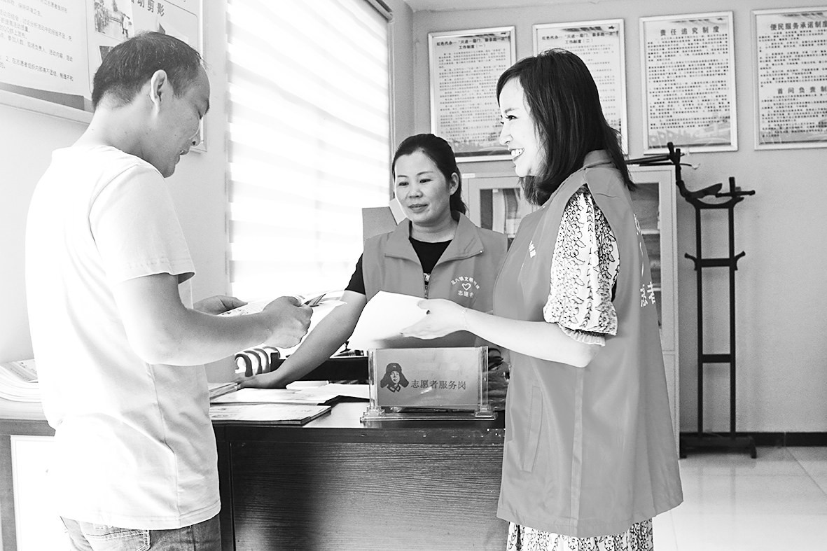 商丘市梁园区双八镇基层商会为促进全社会形成“人人讲文明个个懂礼仪”的良好风尚,在繁华地段设立了志愿服务站。站内设置志愿服务岗,挑选口才好、文明素养高的志愿者为村民服务。据了解,该志愿服务站成立一年多来,接待来访村民一千五百多人次,发放宣传册两万余份。图为:商丘市梁园区双八镇基层商会志愿服务站内,商会志愿服务人员正向村民讲解文明礼仪知识,并赠送文明知识宣传册,助力村民养成文明生活习惯。 (乔文革万为)
