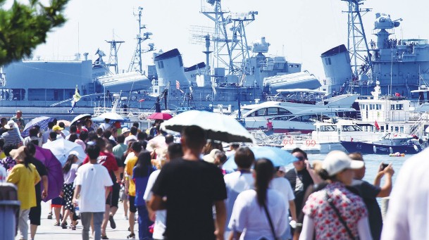 暑期旅游旺季,海滨城市青岛各景区、景点游人如织。图为游客前往青岛海军博物馆参观。