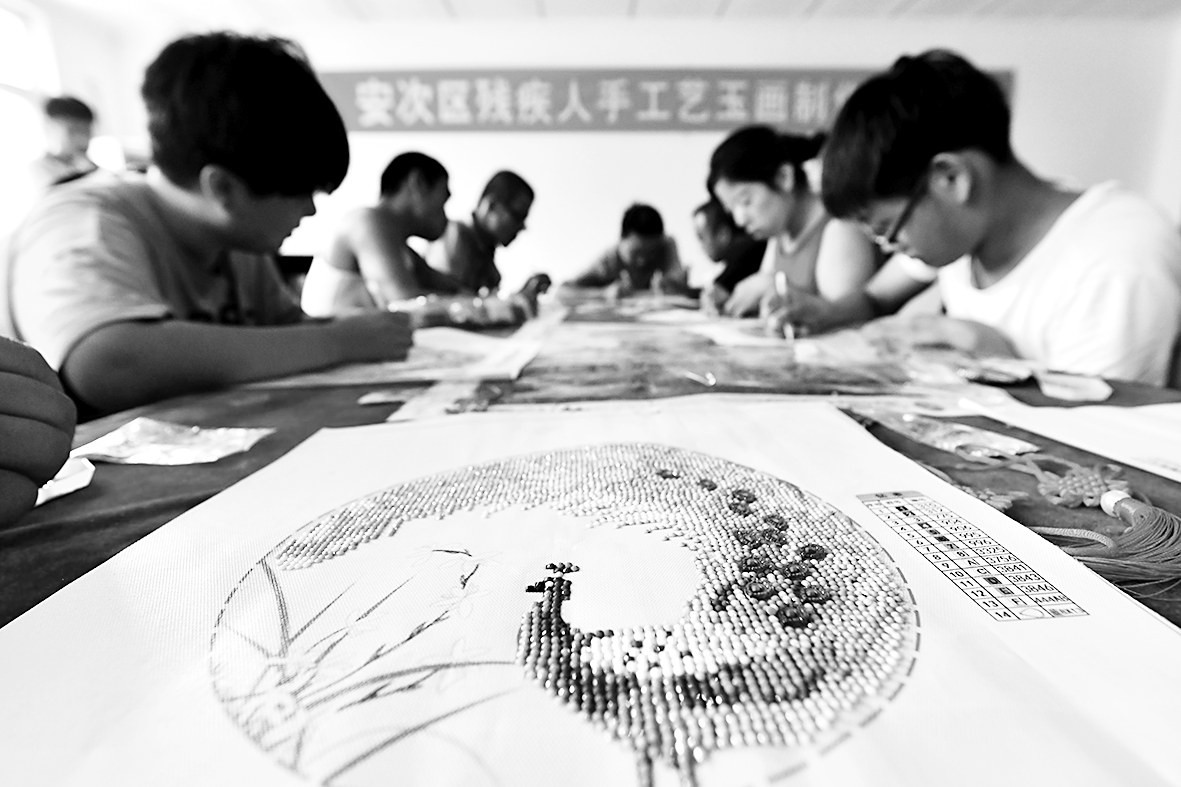 近年来,河北廊坊市安次区大力扶持贫困残疾人就业创业工作,成立精准扶贫创业就业培训基地,通过开设各类培训班,对贫困残疾人进行免费技能培训,探索一条集残疾人技能培训、就业创业、辅助性就业等于一体的精准扶贫助残路径,让贫困残疾人掌握一技之长,实现增收致富。图为在河北廊坊市安次区精准扶贫创业就业培训基地,残疾人在学习手工艺品制作技术。王晓/摄