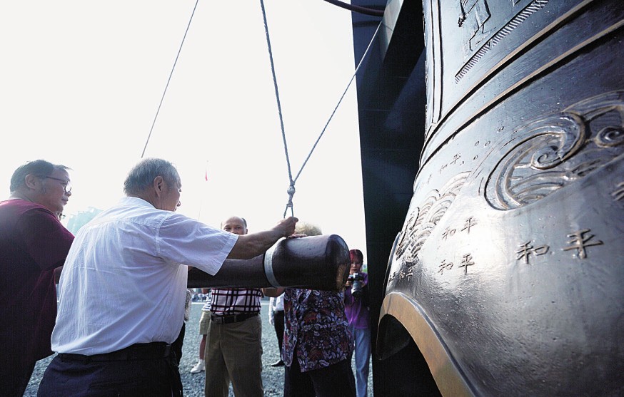 15日,侵华日军南京大屠杀遇难同胞纪念馆举行升国旗仪式,撞响和平大钟,纪念“8·15”日本宣布无条件投降74周年纪念日。图为人们在侵华日军南京大屠杀遇难同胞纪念馆撞响和平大钟。季春鹏/摄