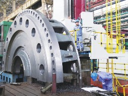 哈电集团哈尔滨电机厂有限责任公司,是我国生产大、中型发电设备的重点骨干企业。企业近年瞄准科技前沿产品,在特种电气装备、新能源等方面也成绩斐然。从“制造”到“智造”,“老牌国企”哈电电机彰显出中国“动力”风采。图为工人在大型数控镗床上加工水轮机顶盖。
