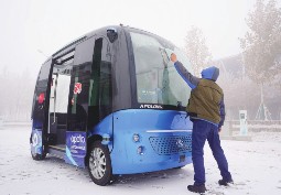 记者探访雄安新区时看到:没有传统收银台的无人超市、没有司机的无人驾驶车、刷脸入住的智慧酒店……这些“无人”元素,在摸索中打造雄安这座未来之城的智慧基因。图为12月10日,工作人员在雄安新区清扫无人驾驶巴士的积雪。