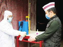 近日,长沙市市场监管局印发了《关于新型冠状病毒肺炎疫情防控期间加强餐饮服务安全监管工作的通知》,要求全面做好食品安全和疫情防控工作。以长沙餐饮企业文和友为例,该餐馆停止堂食,集中全力做好外卖。图为长沙文和友化龙池店工作人员给厨师消毒。
