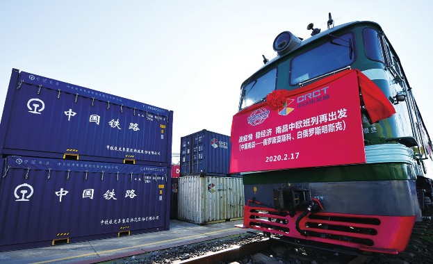 近日,位于江西省吉安市的江西立讯智造有限公司正加大马力生产。一批批海外订单促使立讯恢复满产。预计2020年,公司产值将达300亿元,同比增长57.9%。图为中欧班列(南昌)在南昌向塘铁路口岸等待发车。