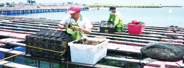 福建省连江县是“中国鲍鱼之乡”,为推动鲍鱼产业转型升级,近期,连江县出台各项扶持产业发展的措施,确保当地鲍鱼产业高质量可持续发展。图为在福建连江县安凯乡沙澳湾的一处鲍鱼养殖基地,养殖人员在往鲍鱼养殖网箱内投放海带。