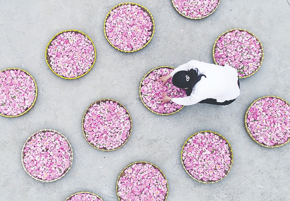 近日,江苏省海安市城东镇石庄村玫瑰种植园内的玫瑰花竞相绽放,农民忙着采摘、装运鲜花,发送到各地的工厂进行精油提炼等深加工。同时,玫瑰园的美丽景致吸引了周边地区的人们前来观光旅游、体验采摘。玫瑰花成为当地农民脱贫致富、乡村振兴的“致富花”。图为在江苏省海安市城东镇石庄村,农民在检查刚采摘的玫瑰花。