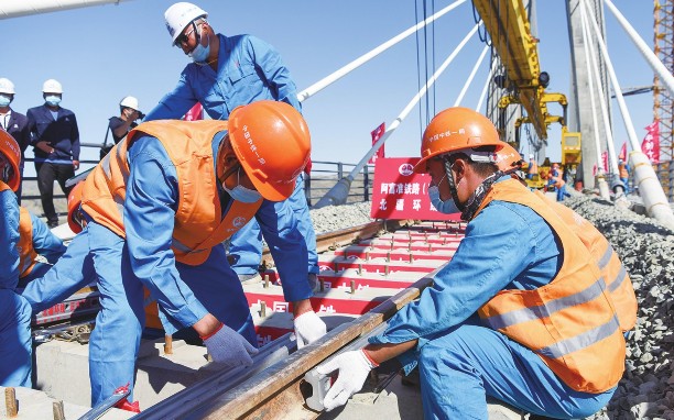 2日,随着最后一组25米轨排推进落地,新疆阿富准铁路(阿勒泰-富蕴-准东)的阿勒泰至富蕴段顺利铺通,标志着阿富准铁路已全线贯通,北疆铁路环线也正式形成。图为中铁一局的施工人员在阿富准铁路阿勒泰至富蕴段进行铺轨作业。