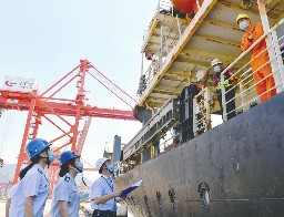 7月21日,在福州青州集装箱码头,国家税务总局福州经济技术开发区税务局工作人员走访停泊码头的集装箱货轮,了解外贸企业的出口状况。