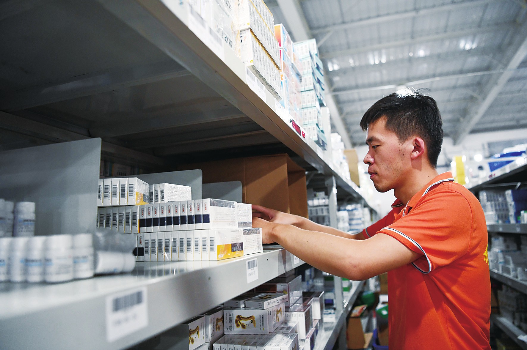 今年2月份以来,河北省衡水市冀州区根据疫情影响和行业现状,坚持把电子商务作为稳定经济增长的重要引擎,主动指导和服务电商企业复工复产,并出台扶持政策促进电商发展,借助电子商务平台拓宽市场,实现产业逆势增长。2020年上半年,冀州区电商企业网络零售额达44.2亿元。图为衡水市冀州区一家医药物流企业工作人员在物流仓储车间整理药品。