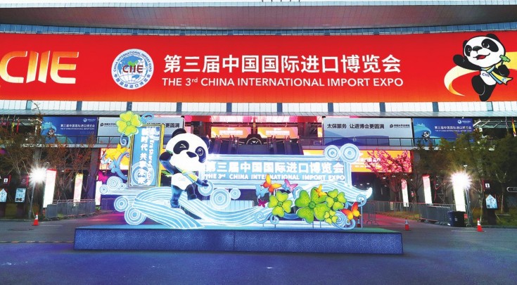 第三届中国国际进口博览会暨虹桥国际经济论坛开幕式于11月4日晚在上海举行。美丽的上海张开怀抱,迎接八方来客。作为全球首个以进口为主题的国家级展会,在全球范围疫情尚未得到全面控制的背景下,第三届进博会是一场特殊的东方之约。图为在国家会展中心(上海)西入口处拍摄的吉祥物“进宝”主题装饰彩灯。