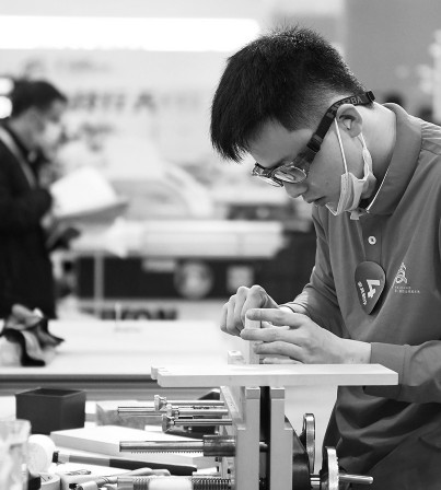12月10日,第一届全国职业技能大赛在广州开幕。首届大赛以“新时代新技能新梦想”为主题,是新中国成立以来规格最高、项目最多、规模最大、水平最高的综合性国家职业技能赛事。图为当日选手在比赛中贴瓷砖。