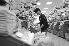 临近岁末,浙江省诸暨市陶朱街道的纺织外贸企业海外订单稳中有增,产能旺盛,不少企业正加班加点赶制外贸订单产品。数据显示,今年第三季度陶朱街道纺织外贸企业销售额比第二季度增长43.7%。图为12月23日,在位于陶朱街道的浙江洛琪袜业有限公司,一名工人在袜机上整理产品。