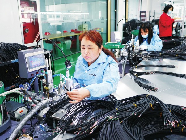 近年来,陕西省安康市积极承接中东部产业转移,大力引进环境友好、用工密集型企业,在保护生态的同时,满足新增城镇人口的就业需求。图为近日,在安康市高新区一家电子终端产品企业车间内,工人在加工数据线。