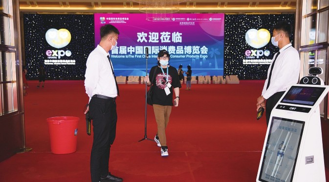 5月7日至10日,首届中国国际消费品博览会将在海南海口举行。图为在海南国际会展中心入口处,智能测温门岗机器人和保安一起执勤。(相关报道见02版)