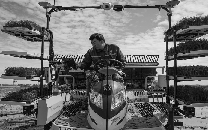 眼下正值水稻插秧时节,在黑龙江北大荒集团红卫农场有限公司智慧农业先行示范区内,无人驾驶智能插秧机穿梭田间,进行精细化插秧作业。据介绍,无人驾驶智能插秧机应用北斗卫星定位系统,田间作业时可实现自动避障、掉头和转弯。同时,车体配备摄像头,将田间秧苗情况通过5G信号,实时传输到智慧农业中心,做到精准插秧,节省人力成本,提高插秧作业效率和质量。图为在北大荒集团红卫农场有限公司智慧农业先行示范区内,工作人员设置无人驾驶插秧机工作路径。