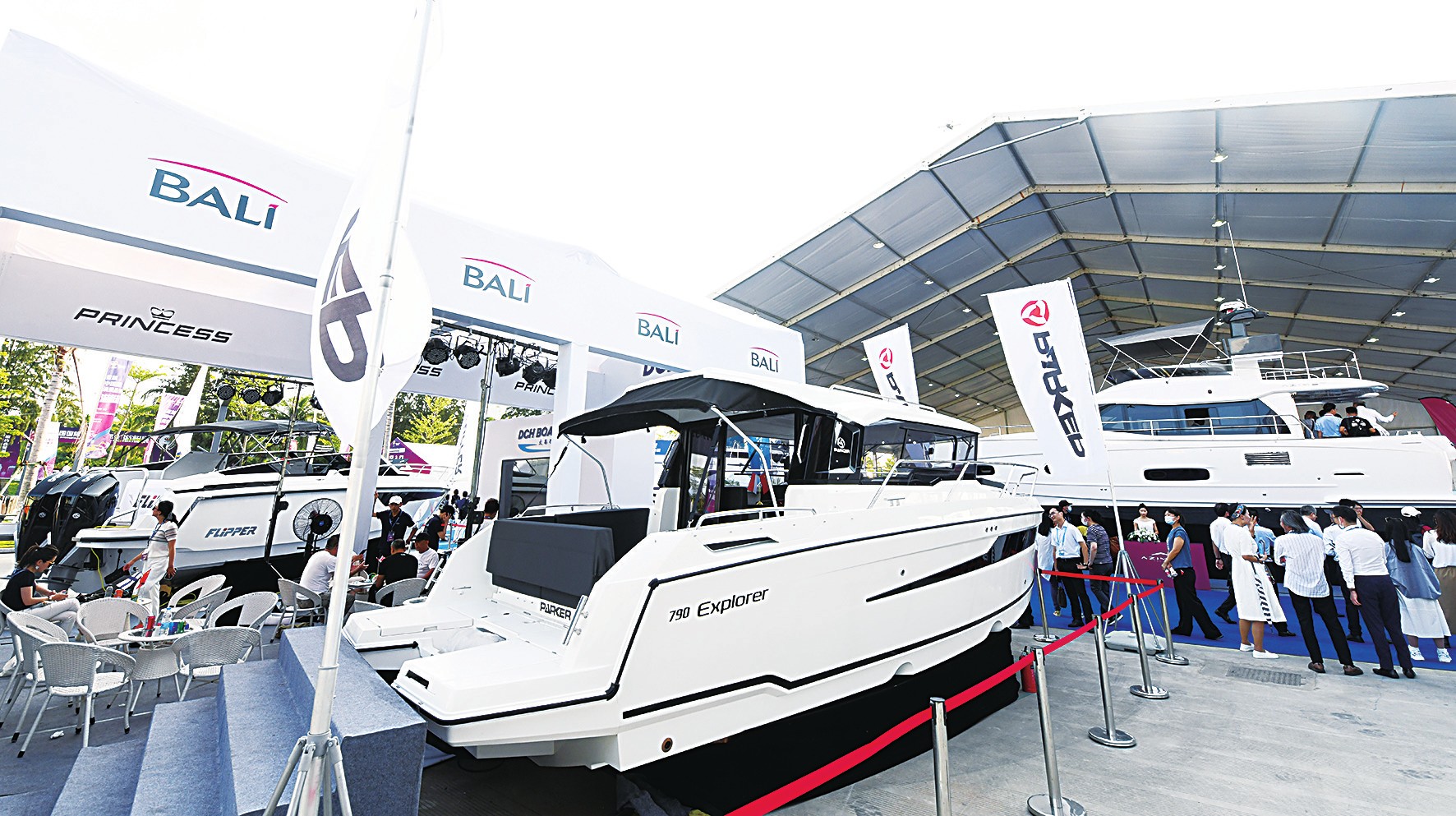 近日,首届中国国际消费品博览会游艇展在海口国家帆船基地公共码头举办,本次展览有58个品牌、107艘游艇参展。图为观众参观陆上展区的参展游艇。