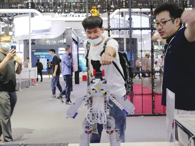 近日,2021世界人工智能大会在上海召开。这是一场AI领域的国际盛会,集聚上千位来自国内外的“最强大脑”、举办近百场高端论坛头脑风暴。这还是一次源头创新和前沿研究成果的惊艳亮相,柔性脑机接口、仿人机器人、人工智能芯片、无人驾驶车等成果首发首展。这更是一场“智联世界,众智成城”的协同共治大会,以技术“向善”为目标,描绘人工智能世界共治共享新蓝图。图为参观者(中)在世界人工智能大会的展览现场体验体感机器人玩具。