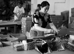 近年来,安徽省宣城市泾县榔桥镇发挥油画笔产业优势,多举措助力油画笔产业发展。目前,榔桥镇拥有油画笔加工企业20多家,年产值超过2亿元,带动1000余人实现就业,助力乡村振兴。图为8月25日,在宣城市泾县榔桥镇一家油画笔企业,工人在包装油画笔。