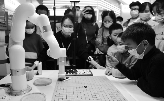 近日,在合肥举行的第四届世界声音博览会暨科大讯飞全球1024开发者节,吸引不少市民前来参观体验。声博会现场设立AI奇趣馆、AI科技馆、AI引力馆、AI共生馆和AI创客馆五大展区,一批与声音相关的AI“黑科技”产品亮相。图为小朋友在第四届世界声音博览会上和机器人下棋。