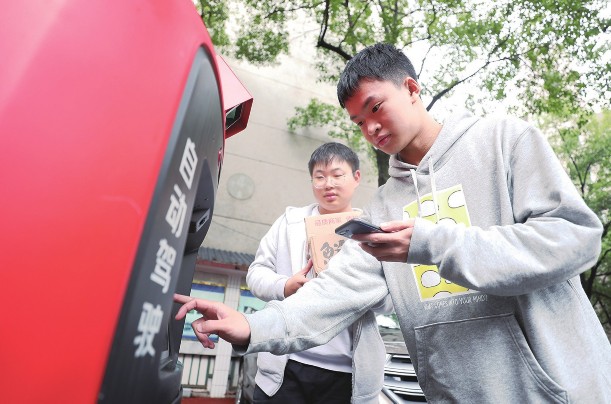 近日,物流公司把无人驾驶快递车开进位于湖南省衡阳市的南华大学。快递车自动行驶于图书馆、食堂和学生宿舍周边,给同学们运送快递。图为湖南省衡阳市南华大学,学生从无人驾驶快递车中取件。