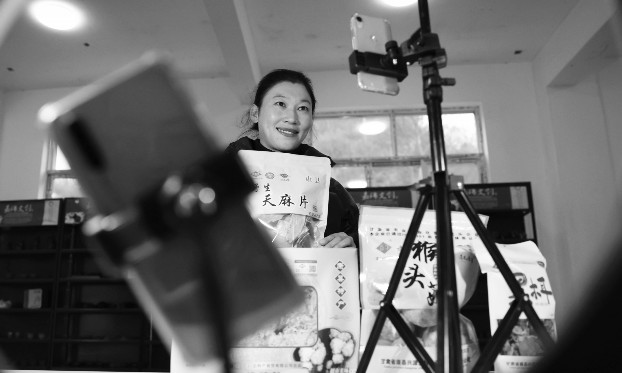 34岁的王小桦是甘肃省陇南市康县王坝镇王家坝村村民。看着身边的一个个村庄变身美丽乡村,她萌生了展现家乡生活美景的想法。从2020年5月开始,王小桦不断琢磨自学短视频拍摄制作并通过网络平台发布,短短一年多的时间里便成为拥有十几万粉丝的乡村“网红”。 随着关注自己的人数增多,王小桦把手机当作“新农具”,开始尝试直播带货,帮着农户销售核桃、食用菌、山野菜和茶叶等。王小桦带货的足迹遍布康县多个乡村,村民称她为带货“小桦”。在她的带动下,村里的年轻人掀起田间地头的直播热潮。王坝镇还专门建设了供村民免费使用的共享网络直播间,鼓励本土“网红”为家乡代言,让越来越多的农特产品插上“电商翅膀”飞出大山。图为王小桦在陇南市康县王坝镇共享网络直播间直播带货。
