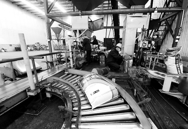 近年来,山东省阳信县翟王镇以特色种植方式促进农民增收,不断发展无公害绿色蔬菜种植产业,并配套建立有机肥生产基地,逐步形成绿色蔬菜种植的规模化、产业化。图为山东省阳信县翟王镇一家生物肥业基地的员工在进行有机肥的包装作业。