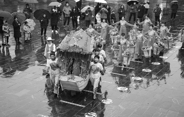 1月24日,安徽省合肥市肥西县三河古镇举办“民俗表演迎新春”文化活动,民间文艺团体表演河蚌舞、大鼓、闹花船等民俗节目,喜迎新春佳节。图为当日民间文艺团体在合肥市肥西县三河古镇表演闹花船。