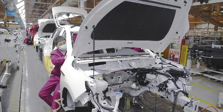 ①工人在江淮汽车乘用车总装车间生产线上忙碌。周牧/摄